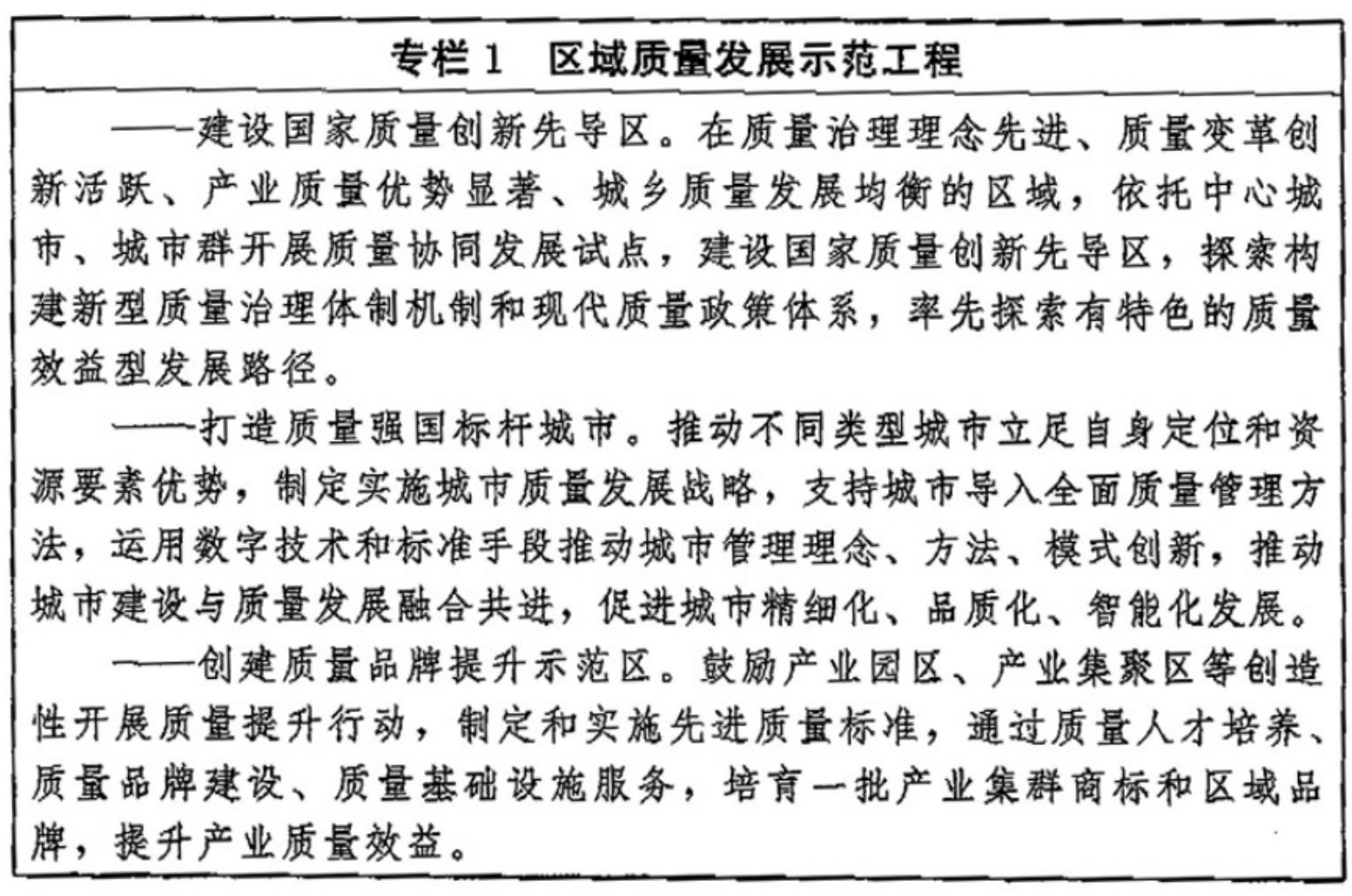 (八)提升产业集群质量引领力。支持先导性、支柱性产业集群加强先进技术应用、质量创新、质量基础设施升级,培育形成一批技术质量优势突出、产业链融通发展的产业集群。深化产业集群质量管理机制创新,构建质量管理协同、质量资源共享、企业分工协作的质量发展良好生态。组建一批产业集群质量标准创新合作平台,加强创新技术研发,开展先进标准研制,推广卓越质量管理实践。依托国家级新区、国家高新技术产业开发区、自由贸易试验区等,打造技术、质量、管理创新策源地,培育形成具有引领力的质量卓越产业集群。