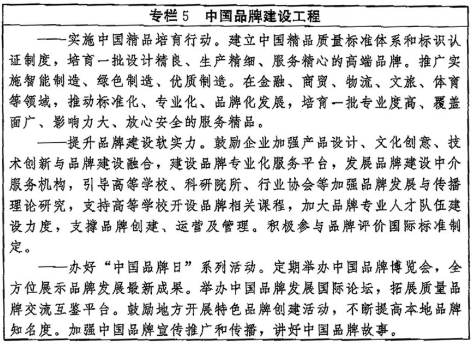 ——品牌建设取得更大进展。品牌培育、发展、壮大的促进机制和支持制度更加健全,品牌建设水平显著提高,企业争创品牌、大众信赖品牌的社会氛围更加浓厚,品质卓越、特色鲜明的品牌领军企业持续涌现,形成一大批质量过硬、优势明显的中国品牌。