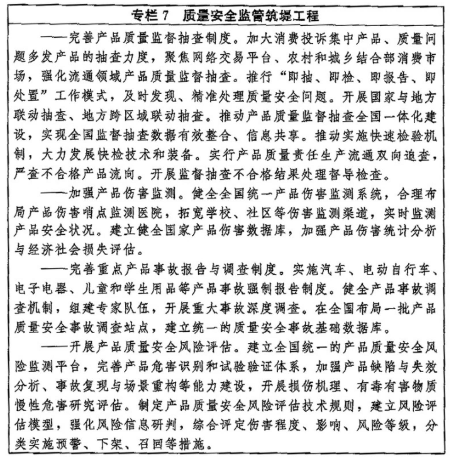 (二十七)优化质量监管效能。健全以“双随机、一公开”监管和“互联网+监管”为基本手段、以重点监管为补充、以信用监管为基础的新型监管机制。创新质量监管方式,完善市场准入制度,深化工业产品生产许可证和强制性认证制度改革,分类放宽一般工业产品和服务业准入限制,强化事前事中事后全链条监管。对涉及人民群众身体健康和生命财产安全、公共安全、生态环境安全的产品以及重点服务领域,依法实施严格监管。完善产品质量监督抽查制度,加强工业品和消费品质量监督检查,推动实现生产流通、线上线下一体化抽查,探索建立全国联动抽查机制,对重点产品实施全国企业抽查全覆盖,强化监督抽查结果处理。建立健全产品质量安全风险监控机制,完善产品伤害监测体系,开展质量安全风险识别、评估和处置。建立健全产品质量安全事故强制报告制度,开展重大质量安全事故调查与处理。健全产品召回管理体制机制,加强召回技术支撑,强化缺陷产品召回管理。构建重点产品质量安全追溯体系,完善质量安全追溯标准,加强数据开放共享,形成来源可查、去向可追、责任可究的质量安全追溯链条。加强产品防伪监督管理。建立质量安全“沙盒监管”制度,为新产品新业态发展提供容错纠错空间。加强市场秩序综合治理,营造公平竞争的市场环境,促进质量竞争、优胜劣汰。严格进出口商品质量安全检验监管,持续完善进出口商品质量安全风险预警和快速反应监管机制。加大对城乡结合部、农村等重点区域假冒伪劣的打击力度。强化网络平台销售商品质量监管,健全跨地区跨行业监管协调联动机制,推进线上线下一体化监管。