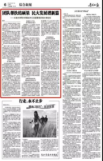 《青海日报》9月17日06版头条刊发题为《团队帮扶结硕果》的文章,报道以天津大学为组长单位的六所高校对青海民族大学的“团队式”帮扶。报道称,天津大学以服务国家的战略担当、对西部民族高校的深情厚谊,全力以赴、高效务实地推进对口支援工作,为青海民族大学的学科专业、师资队伍、人才培养、科学研究做了许多开创性工作,谱写了一曲东部高校支援西部高校共同发展的新篇章。