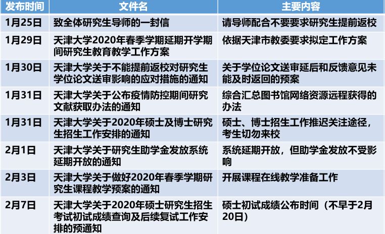 日前,天津大学为应对新冠肺炎疫情,对疫情期间的重要工作做了提前部署安排,启动了研究生教学科研工作预案,迅速行动,落实责任,在严防疫情的同时,保障“停课不停学、延期不延教”,采取延长博士研究生网上报名时间以及网络授课等措施,确保研究生教学科研管理工作有序推进。