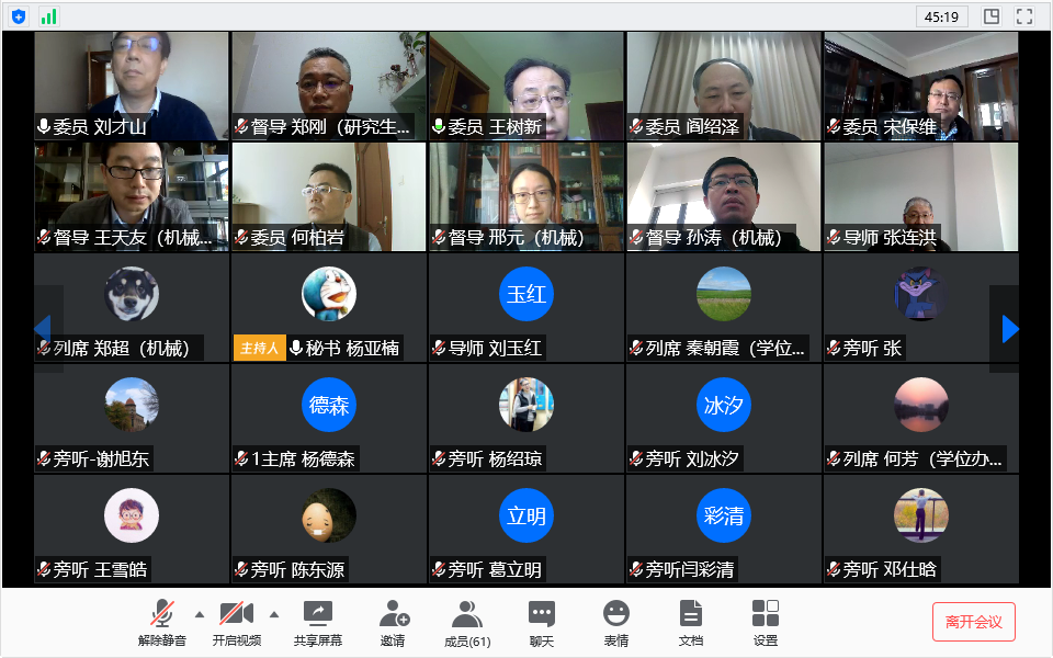 此次答辩作为天津大学疫情期间的首场线上答辩,研究生院学位办公室主任何芳、机械工程学院院长王天友、副院长孙涛作为校院两级督导人员参加了答辩会,此外,答辩还吸引了机械学院相关领域50余名师生旁听。