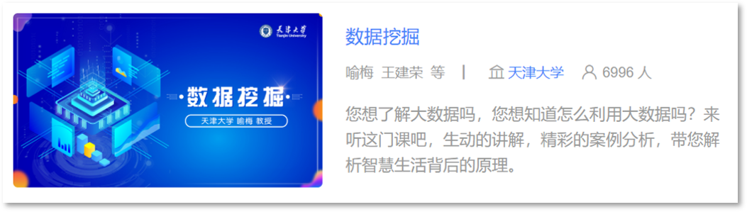 智算学部喻梅老师的《数据分析与数据挖掘》是面向全校研究生开设的跨学科选修课。在“研究生创新人才培养”项目的支持下,已探索形成基于MOOC的混合教学模式,课程2016年获全国工程硕士专业学位研究生在线课程重大建设项目,并获评2019年度天津市工程专业学位优秀课程。在“学堂在线”平台开设MOOC课程以来,已有5000余人选修学习,亦包括很多社会学习者。