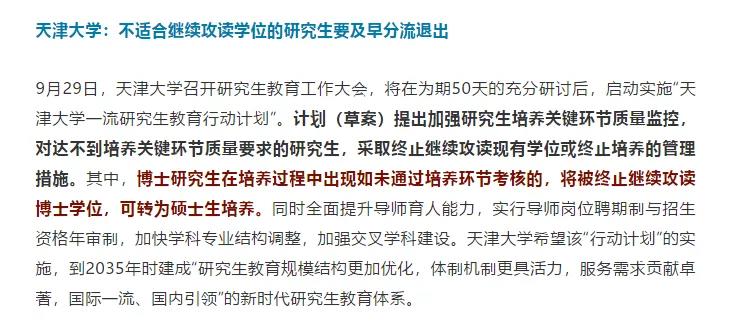 9月29日,天津大学召开研究生教育工作大会,将在为期50天的充分研讨后,启动实施“天津大学一流研究生教育行动计划”。计划(草案)提出加强研究生培养关键环节质量监控,对达不到培养关键环节质量要求的研究生,采取终止继续攻读现有学位或终止培养的管理措施。其中,博士研究生在培养过程中出现如未通过培养环节考核的,将被终止继续攻读博士学位,可转为硕士生培养。同时全面提升导师育人能力,实行导师岗位聘期制与招生资格年审制,加快学科专业结构调整,加强交叉学科建设。天津大学希望该“行动计划”的实施,到2035年时建成“研究生教育规模结构更加优化,体制机制更具活力,服务需求贡献卓著,国际一流、国内引领”的新时代研究生教育体系。