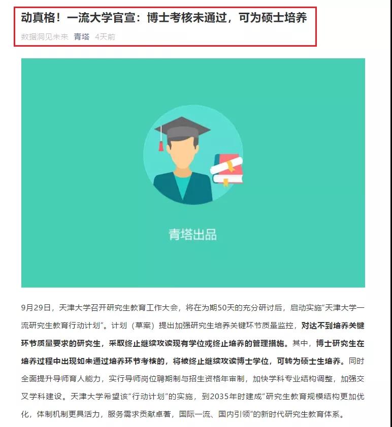青塔——动真格!一流大学官宣:博士考核未通过,可为硕士培养