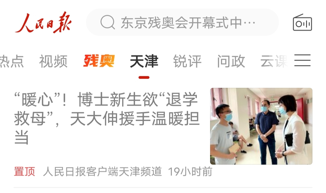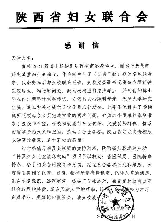 8月24日,一封情真意切的感谢信在天津大学迅速流传。这是陕西省妇联专门写给学校的感谢信:“天津大学解决了2021级博士新生杨楠既要照顾母亲又要完成学业的两难问题,也为这个困难的家庭带来了温暖和希望。贵校积极履行社会责任、关爱弱势群体、情系困难学子的大义和担当,感动了社会各界!”
