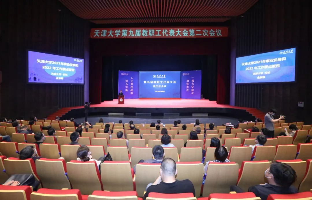 5月6日,天津大学第九届教职工代表大会第二次会议、第十七届工会会员代表大会第二次会议在北洋园校区求实会堂报告厅隆重召开。本次大会的主题是:深入学习贯彻党的十九大和十九届历次全会精神,认真贯彻落实习近平总书记关于教育的重要论述,完整、准确、全面贯彻新发展理念,聚焦“内涵式高质量发展”主题,巩固拓展巡视整改成果和党史学习教育成果,围绕立德树人根本任务,以改革创新为动力,推动学校各项事业高质量发展,用一往无前的奋斗姿态和永不懈怠的精神状态,谱写天津大学迈向世界一流大学的新篇章,以优异成绩迎接党的二十大胜利召开。