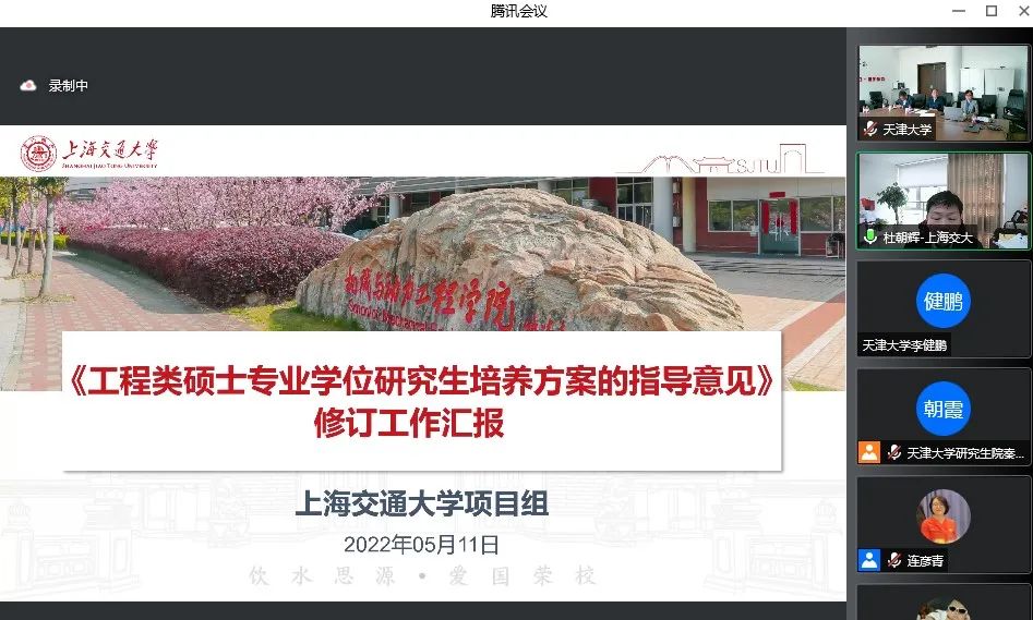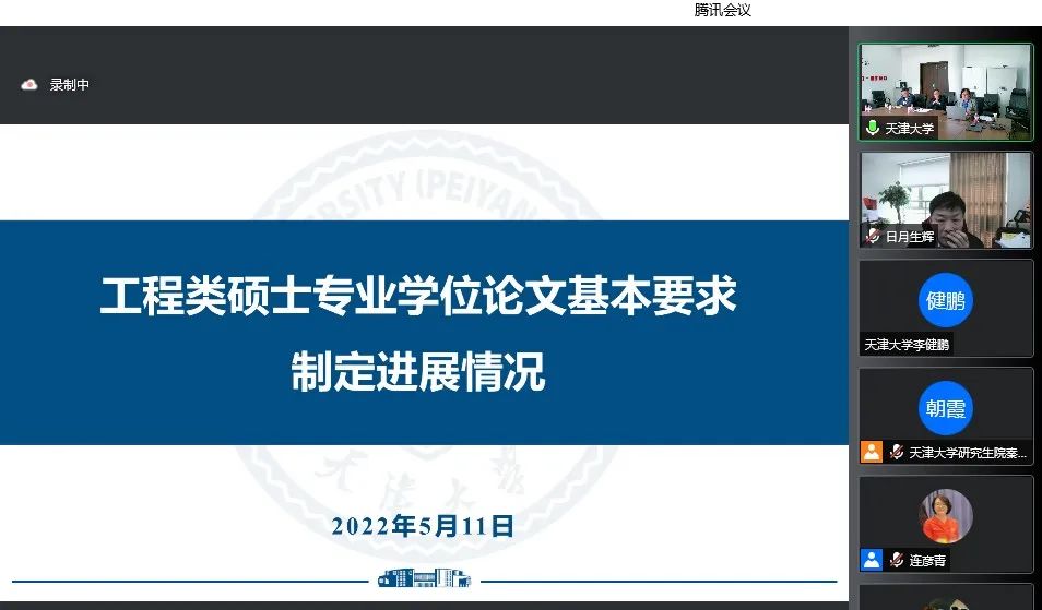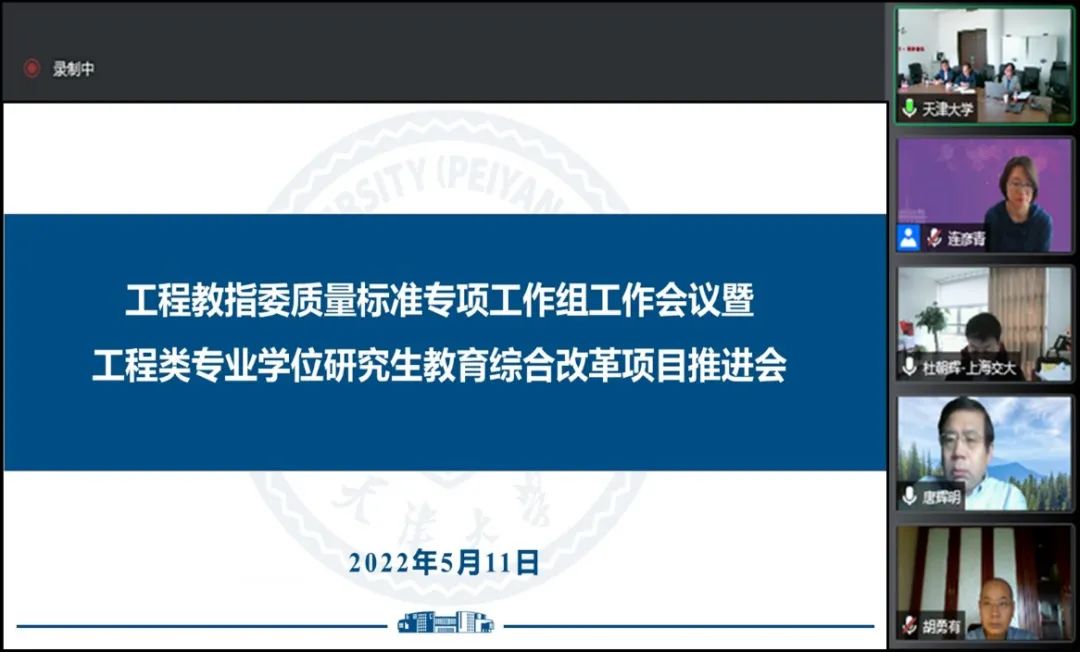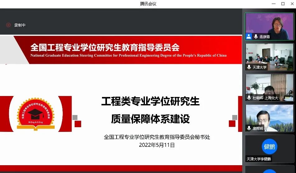 为深入贯彻习近平总书记关于研究生教育工作的重要指示精神和全国研究生教育会议精神,落实《深化新时代教育评价改革总体方案》,进一步提高我国工程类专业学位研究生培养质量,2022年5月11日下午,全国工程专业学位研究生教育指导委员会(以下简称工程教指委)“质量标准专项工作组”工作会议暨工程类专业学位研究生教育综合改革项目推进会以线上网络视频会议方式举行。工程教指委质量标准专项工作组全体成员、工程类专业学位研究生教育综合改革项目全体参与人员、工程教指委秘书处相关工作人员线上参加了会议,会议由工程教指委副主任委员、中国工程院院士、天津大学党委常务副书记王树新主持。