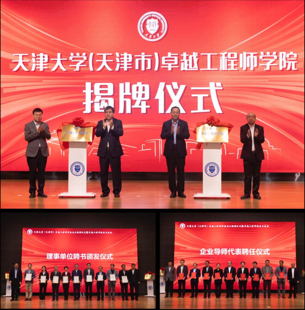 巩金龙、罗延安分别宣读了建设天津大学卓越工程师学院与天津市卓越工程师学院的决定,王旭、罗延安、杨贤金、金东寒共同为天津大学卓越工程师学院与天津市卓越工程师学院揭牌。随后,王旭、杨贤金向国家电网天津市电力公司、厦门盈趣科技股份有限公司、新奥集团股份有限公司、中国兵器工业集团有限公司、中国电子科技集团有限公司、中国国际工程咨询有限公司、中国航天科工集团有限公司、中国化学工程集团有限公司及中国通用技术(集团)控股有限责任公司等9家单位颁发理事单位聘书,罗延安、金东寒向9名企业导师代表颁发企业导师聘书。