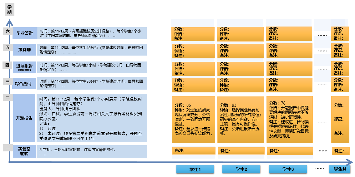 “纵向”为每位研究生建立个人培养档案,将入学至毕业的各个环节进行跟踪;“横向”将所有学生培养过程进行汇总比较,对学生的进展情况精准定位,以完善个性化培养方式或是否启动预警机制。