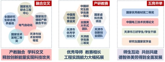 本成果实施以来,电气类卓越工程人才培养水平显著提升。获批国家地方联合工程中心、国家储能技术产教融合创新平台、全国工程专业学位研究生联合培养示范基地及校企联合研究中心8个。校企联合培养研究生500余人,开展深层次合作项目60余项,获得国家科技进步和技术发明二等奖、天津市技术发明特等奖和一等奖等省部级及以上科技奖8项。编写的国家级规划教材获首届国家优秀教材奖二等奖、天津市课程思政优秀教材、中国电力教育协会高校电气类专业精品教材。培养的研究生获中国青年创新创业大赛金奖1项、中国研究生数学建模竞赛一等奖2项、中国电工技术学会优秀博士论文/天津市优秀专业学位论文/天津市优秀硕士学位论文8篇、天津市三好学生/优秀学生干部6人次、国家奖学金30人次、撰写英文博士论文参加国际评审等4人次。