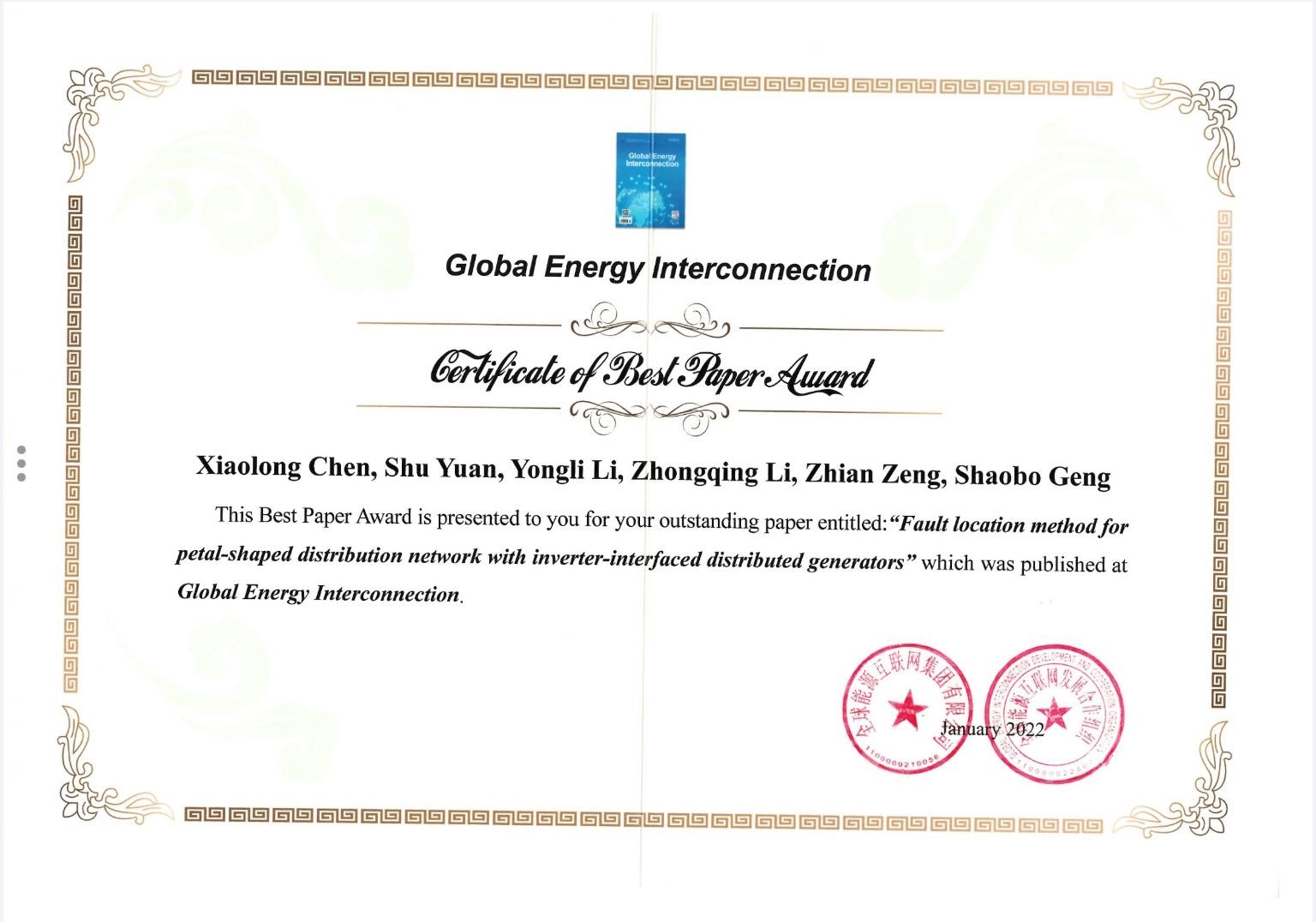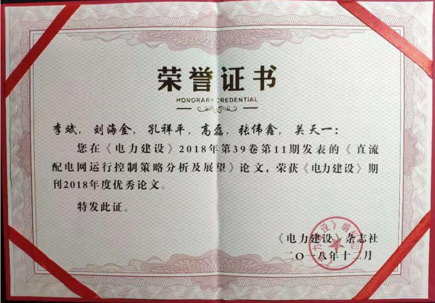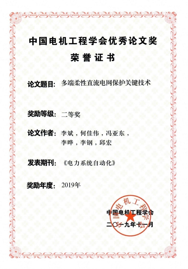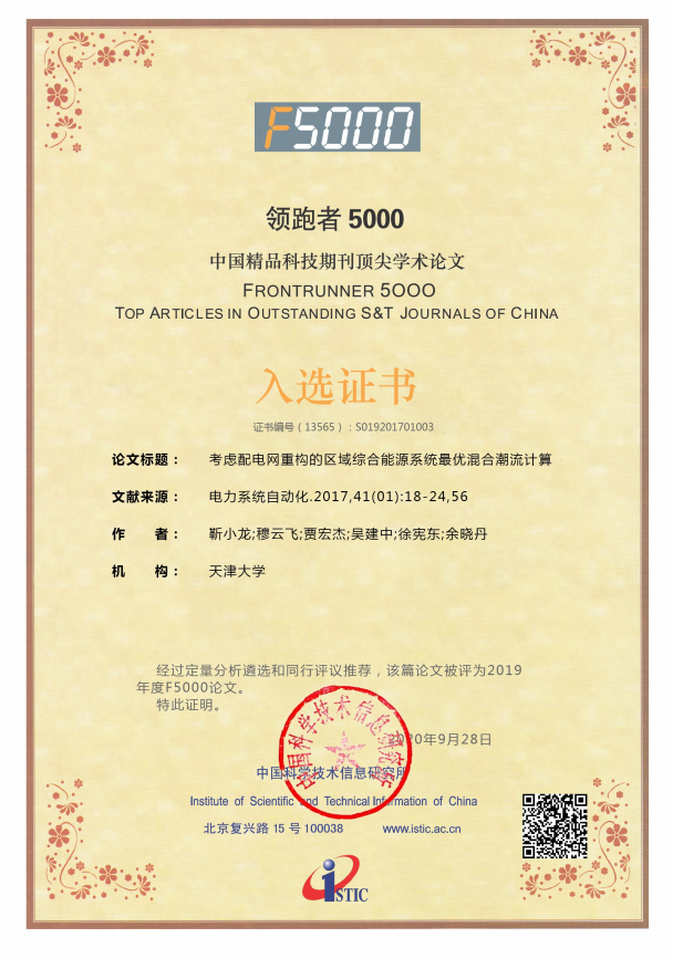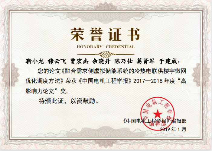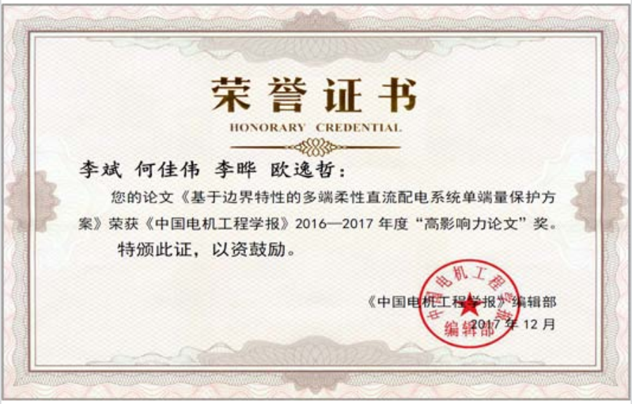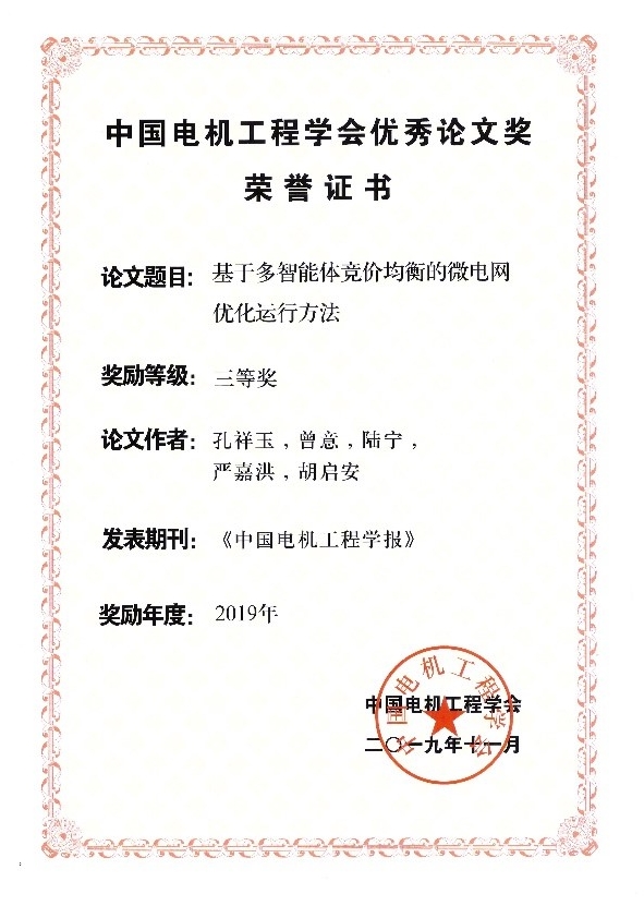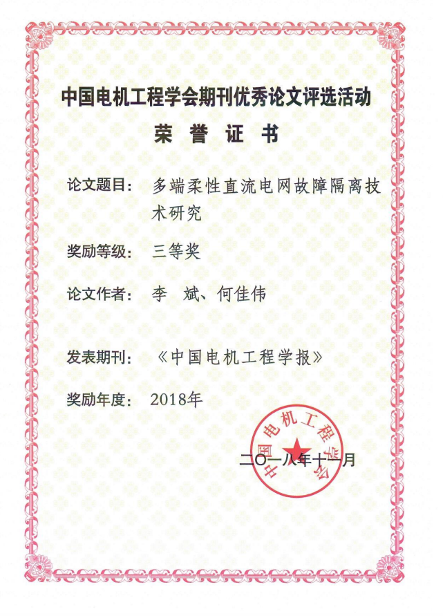 中国电机工程学会期刊优秀论文三等奖(2018年)