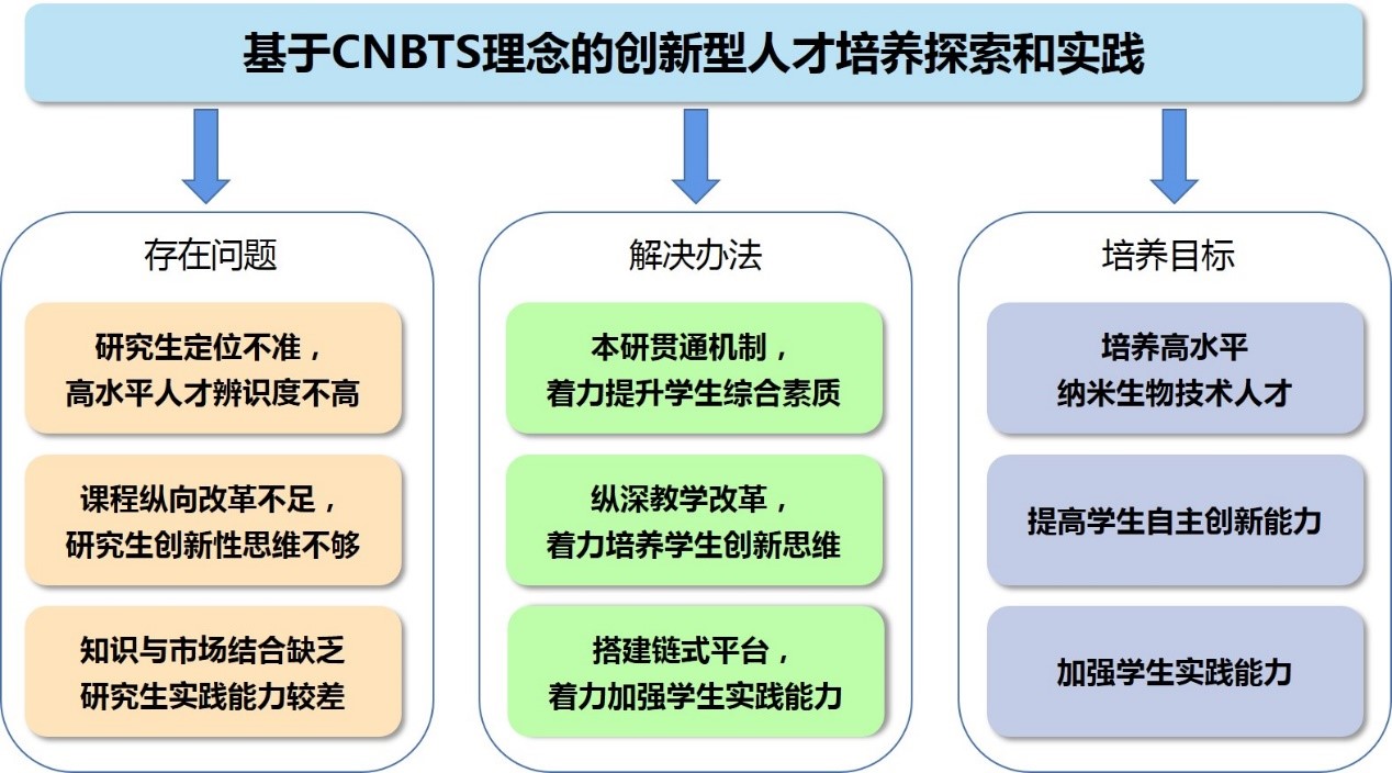 利用本专业“拔尖计划”和“强基计划”为基础,深入开展本研贯通培养,着重梳理纳米生物技术人才应该具有的素质属性,进一步明确人才培养的定位与发展方向。以“为党育人、为国育才”为目标,紧跟国家重大发展方向,加强具有“家国情怀和全球视野”的研究生人才的培养。从本科大创课题和竞赛开始,到研究生期间让学生参与到国家重点研发专项等重大项目实践当中,将“家国情怀”根植于学生日常科研中。聚焦“国家需求”与“高层次”人才两个关键点,培养具有“家国情怀,全球视野,创新精神和实践能力”的高水平纳米生物技术人才