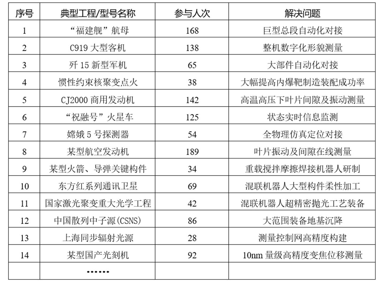 近5年,研究生参与18项国家重点工程/型号建设(图5),累计开展工程实践1600余人次,参与人数达300余名,解决了大量标志性现场测量难题(表1)。其中,在江南船厂首次建设“数字化船坞”,成功应用于国产航母“福建舰”的建造,实现了5000吨级巨型总段的精准快速对接,有力保障了重点型号研制进度和质量(见支撑证明材料2)。