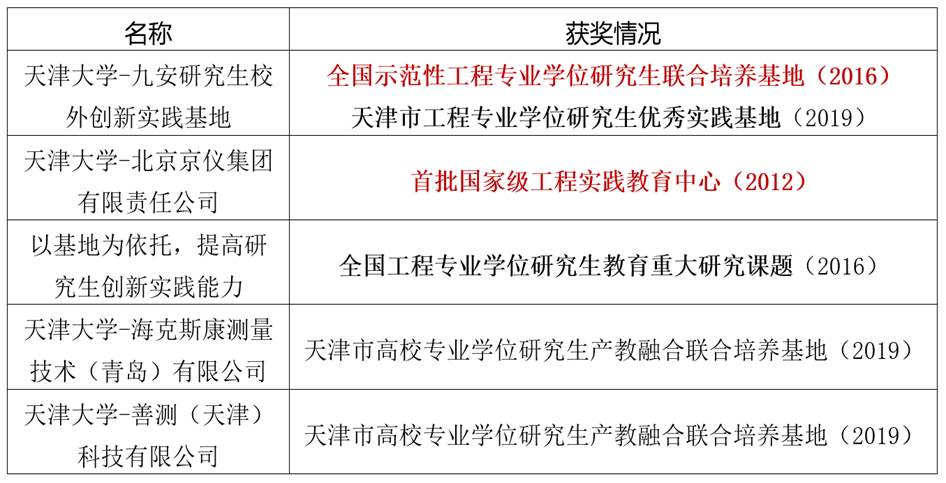 建立“天津大学-江南造船实习实践基地”等33个校企合作创新实验室和实践教学基地(表3,表4,图6),夯实实践育人环节,聘任42位知名产业专家为兼职教师,实施校企双导师制度,研究生专业实践实现100%覆盖(见支撑证明材料7),在中国“互联网+”创新创业大赛等产学结合的知名赛事中屡创佳绩(表5,见支撑证明材料4)。