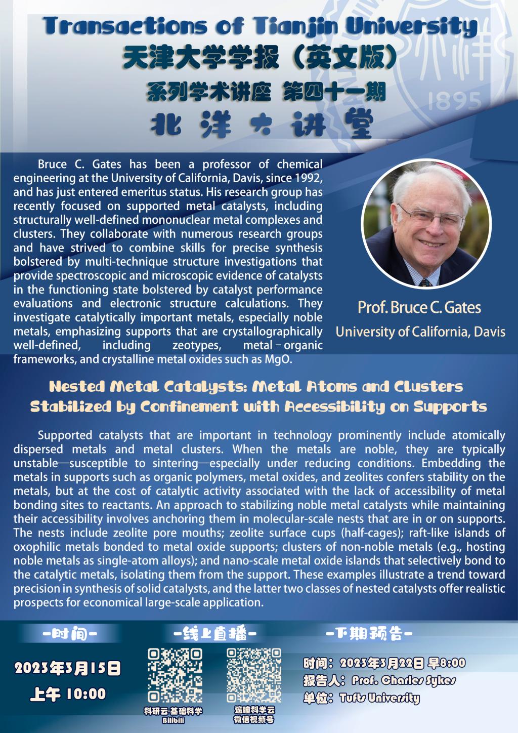 2023年3月15日上午10点,天津大学学报(英文版)系列学术讲座第41期将在科研云Bilibili和邃瞳科学云微信视频号平台上线!本期我们邀请到Prof. Bruce C. Gates (University of California, Davis)带来题为“Nested Metal Catalysts: Metal Atoms and Clusters Stabilized by Confinement with Accessibility on Supports”的精彩讲座!更多精彩,敬请期待!