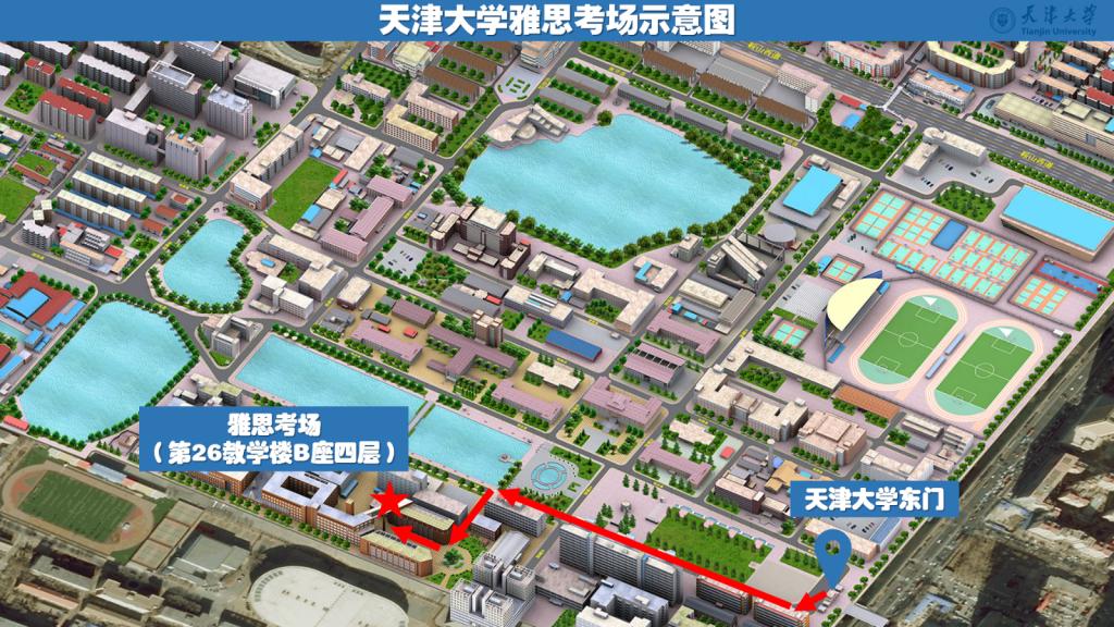 一、考生须按规定从卫津路七里台桥附近的天津大学东门进、出校园,按照指定路线,步行约10-15分钟到达口试、笔试楼第26教学楼B座四层(科学图书馆后)。东门是考生进出校的唯一入口,其他校门禁止出入,请考生注意不要因走错校门导致考试迟到(后附校园地图)。请考生预留足够时间,提前到达考场以确保有足够时间完成防疫核查及信息填报流程。