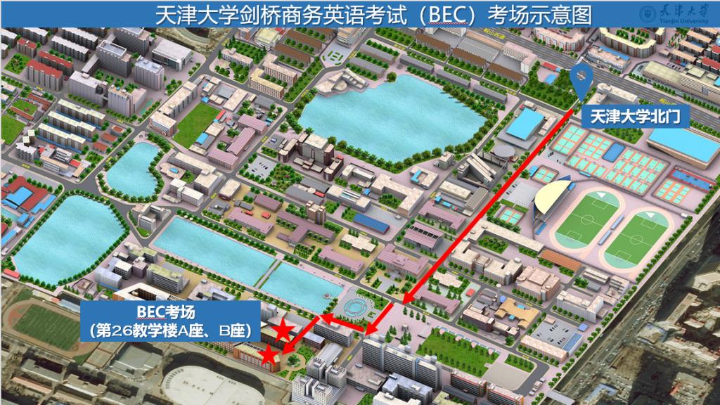 1.考生须从天津大学(卫津路校区)鞍山西道一侧的天津大学北门进、出校园,步行、非机动车和机动车均需要至少15分钟方可到达考场(第26教学楼),北门是考生进出校的唯一入口,其他校门禁止出入,请考生注意不要因走错校门导致考试迟到(后附校园地图)。