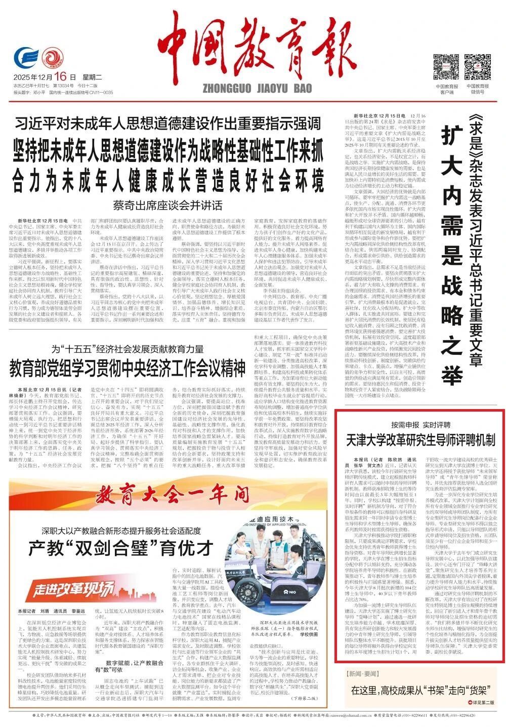 2025年12月16日,《中国教育报》头版刊发了题为《按需申报 实时评聘 天津大学改革研究生导师评聘机制》的文章,对天津大学研究生导师发展中心一年来的主要改革举措进行了报道。
